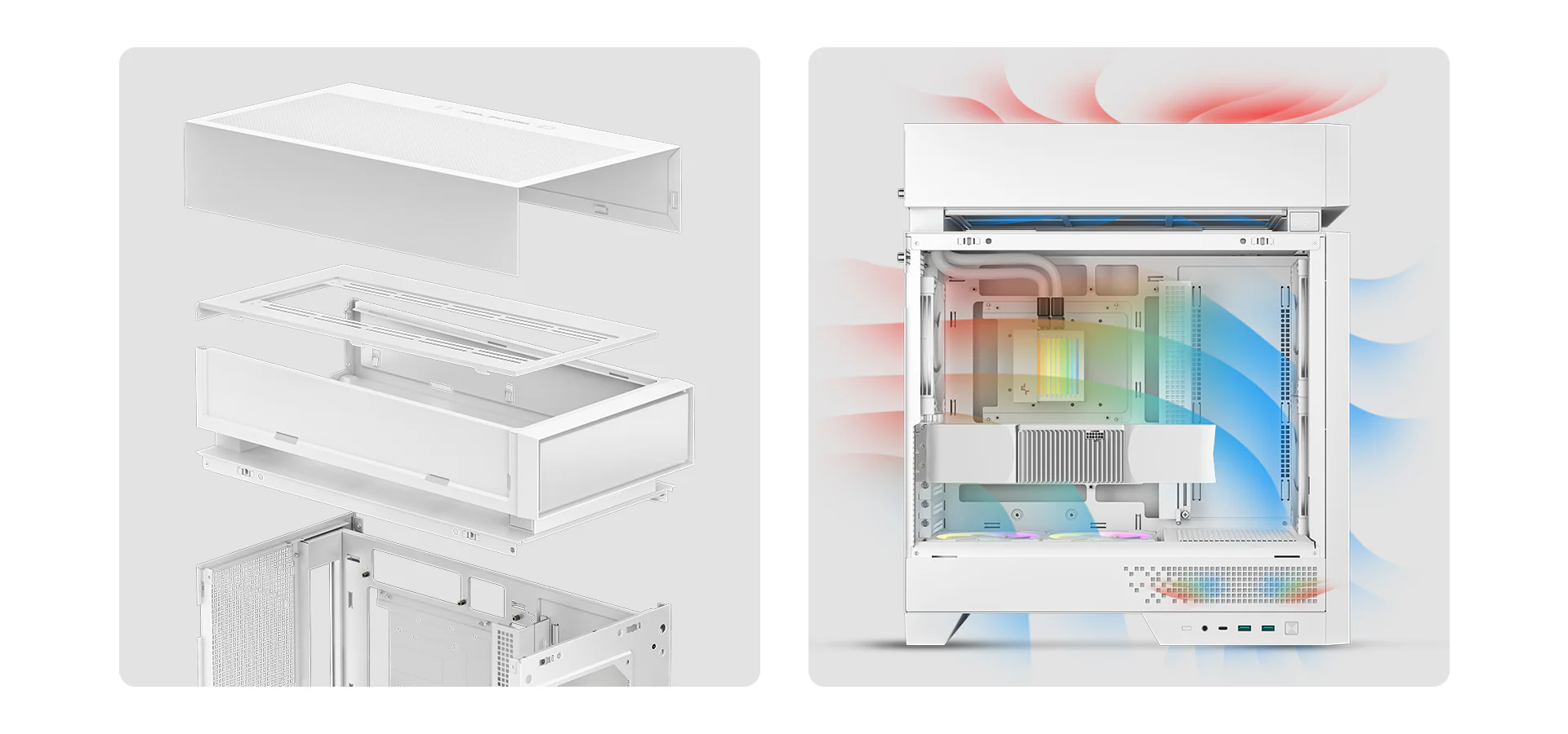 CL6600 adopts a modular split-chamber layout that places the radiator in its own dedicated chamber, separating the CPU’s cooling path from the GPU. This clear separation prevents heat from converging in a single space and eliminates the thermal interference commonly seen in traditional designs.