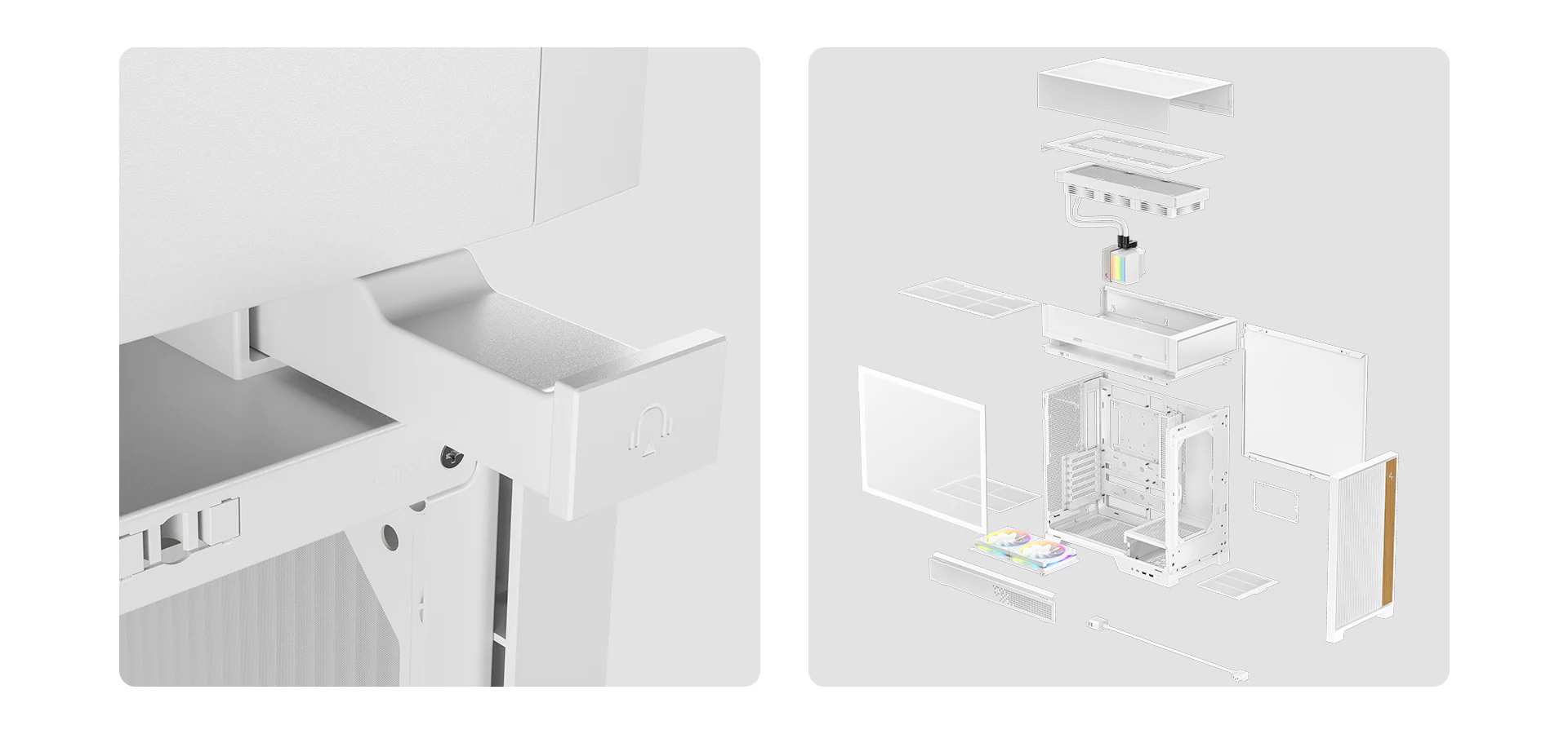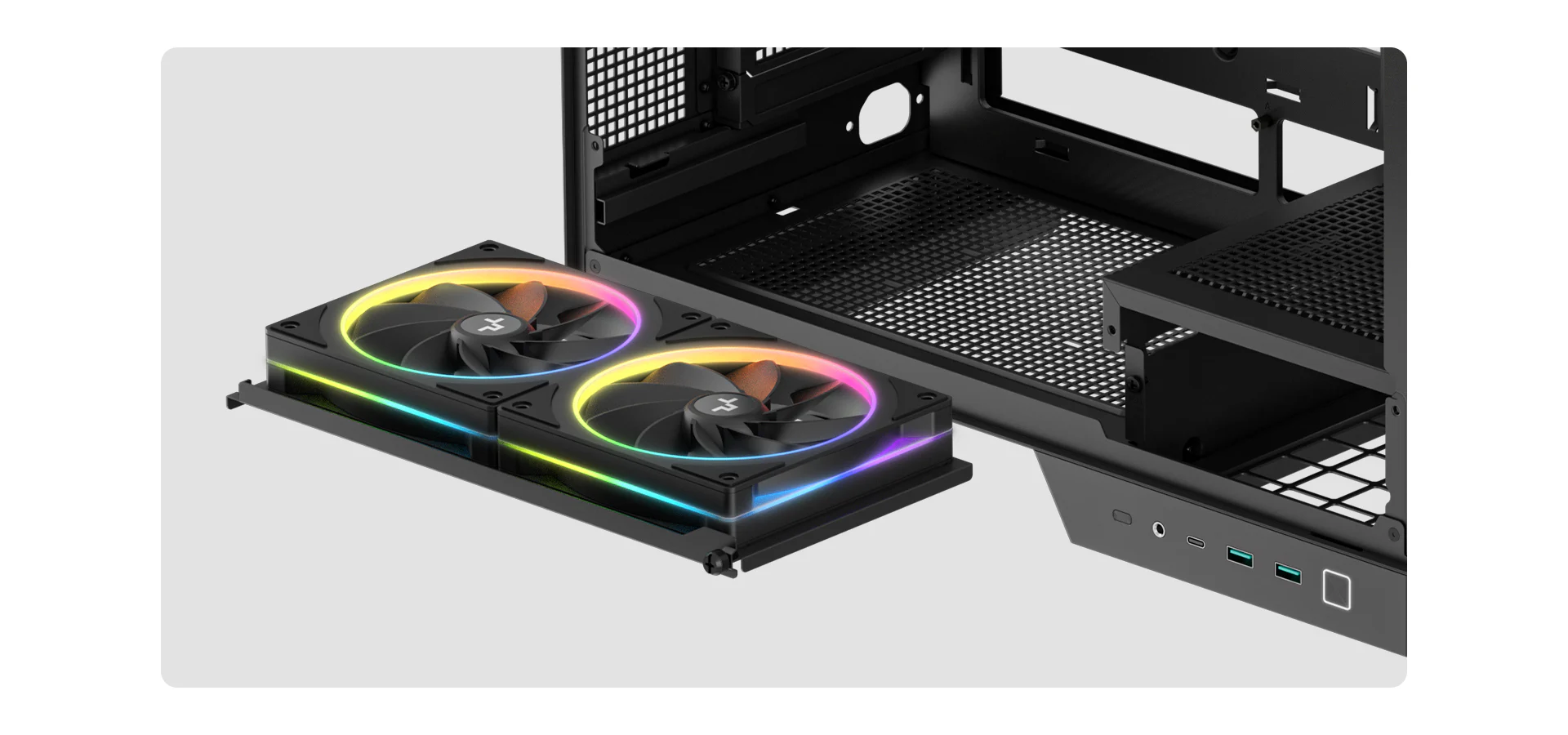 Two reverse-blade FL12 SE fans come pre-installed on a pull-out bottom bracket. Combined with the high-clearance bottom structure, they deliver a strong stream of cool air directly toward the GPU, strengthening thermal performance where modern systems need it most.