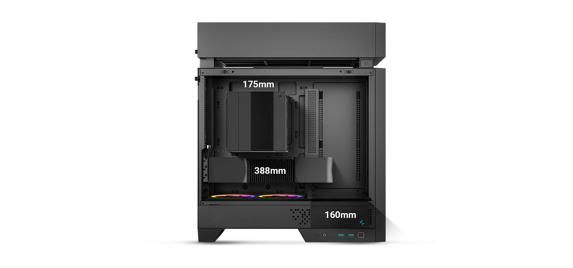 The CL6600 offers extensive hardware support, accommodating GPUs up to 413 mm in length (388 mm with front fan installed). It fits PSUs up to 160 mm and supports air coolers up to 175 mm in height. The case also supports the back-connected motherboards, with ample routing space behind the tray for clean cable management.