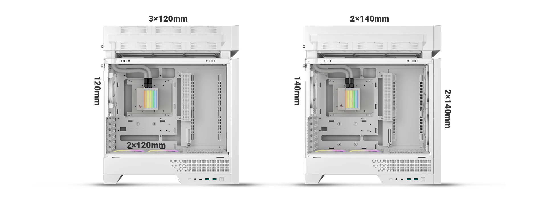 Paired with three FDB fans and housed in an independent chamber, the cooling system operates without competing against the heat inside the main hardware area, allowing it to perform at its full potential. A shorter tube layout further enhances the internal aesthetics by keeping the CPU socket area uncluttered.