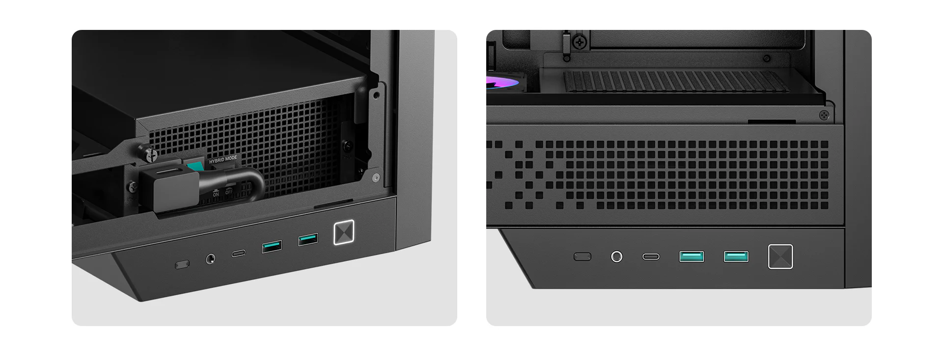 The PSU mounted at the front of the case, exhausting through dedicated vent so its airflow does not interfere with the main chamber. With the connectors facing the back of the motherboard, cables no longer need the tight bends often required in traditional layouts. A PSU extension cable is included for rear power access.