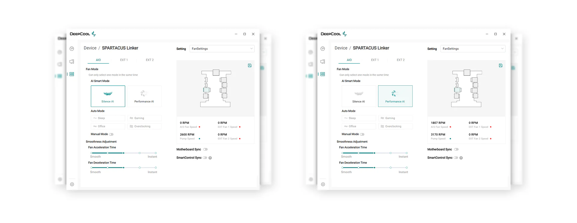 With the upgraded DeepCreative software, the SPARTACUS 360 offers dynamic control over cooling performance and acoustics. Users can seamlessly switch between AI-driven automatic balancing or tailored Environmental Modes, including Sleep, Office, Gaming, and Overclocking, ensuring optimal performance and noise levels for any scenario.
