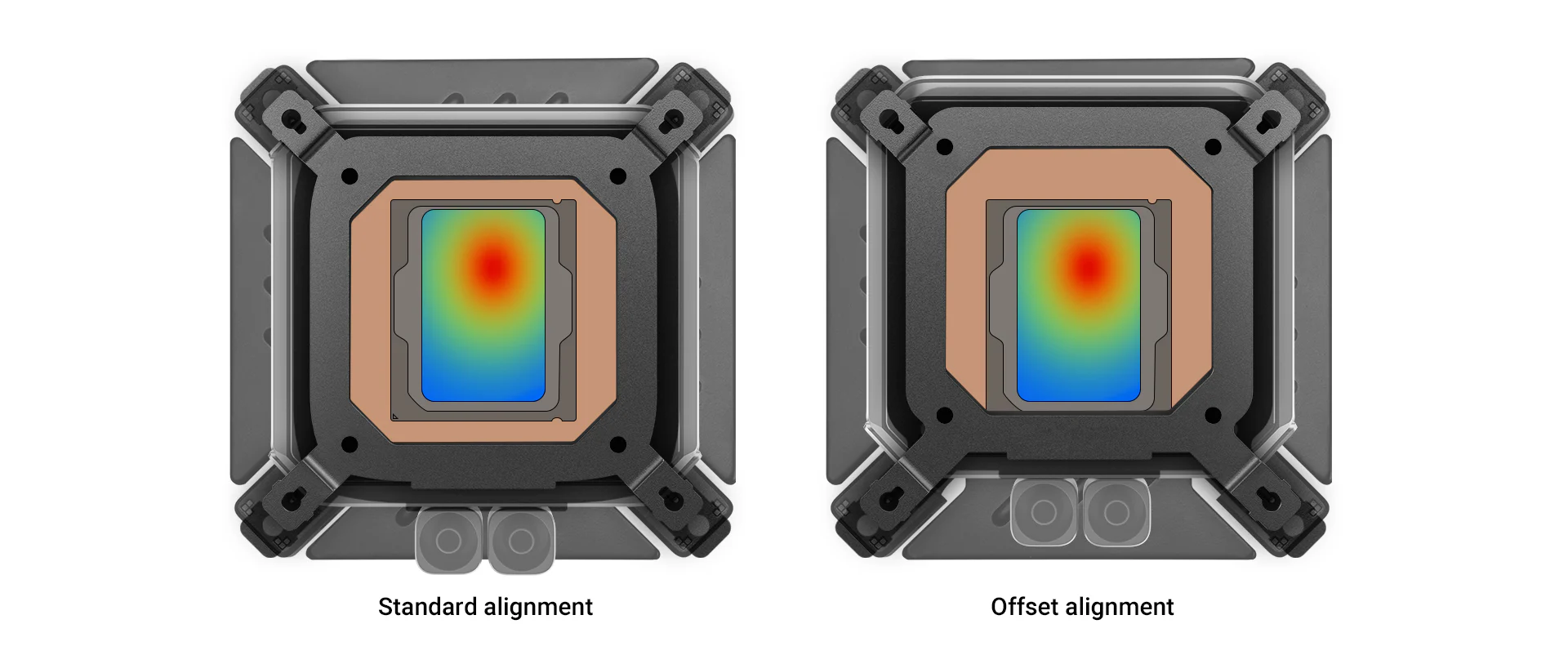 The newly designed offset mounting bracket improves contact efficiency on Intel 24- or 20-core LGA1851 processors. By shifting the cold plate to align more directly with the CPU’s primary hotspot, the cooler can reduce core temperatures by 1-3°C*.
