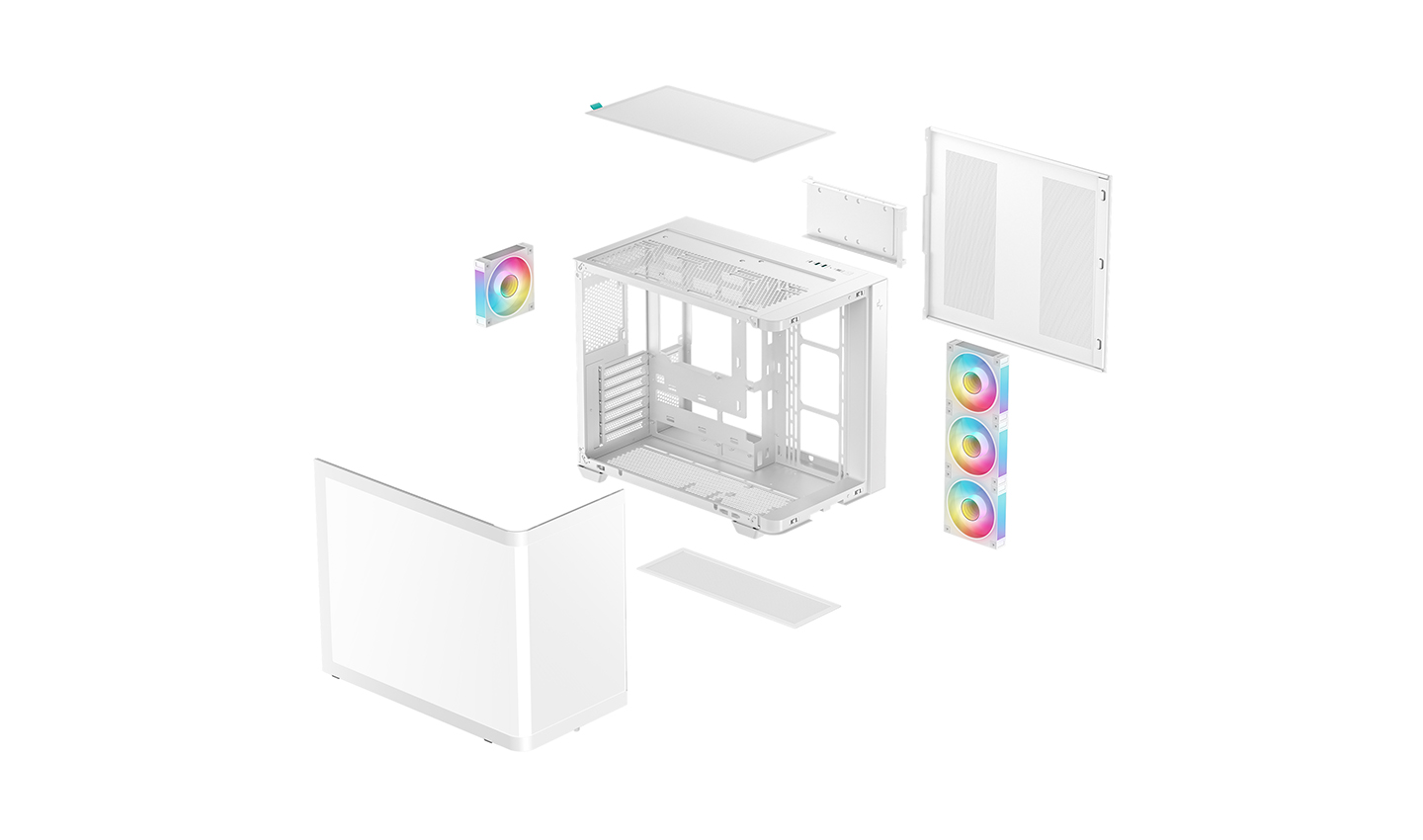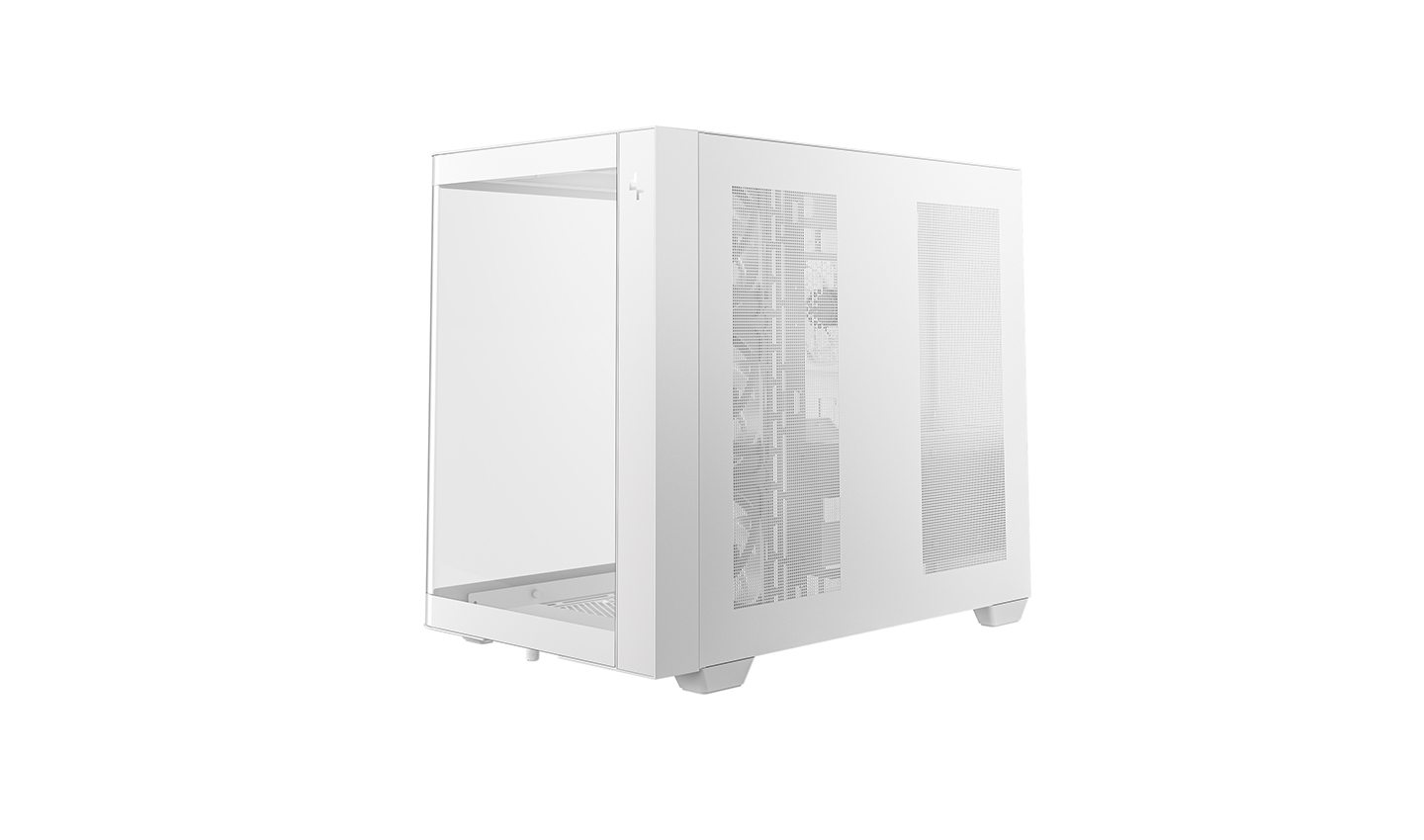 The CG530U 4F WH is a curved-glass panoramic case built on a dual-chamber design. Pre-installed with four ARGB fans, it comes ready for effective airflow and lighting.