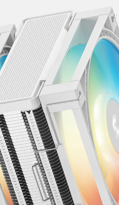 Outfitted with all-new closed-wheel ARGB fans, the AG620 G2 WH ARGB optimizes airflow and static pressure for powerful yet quiet cooling. The reinforced blade structure boosts stability and durability, while preventing unwanted lateral airflow to deliver focused airflow and eliminate dead zones for maximum cooling efficiency.