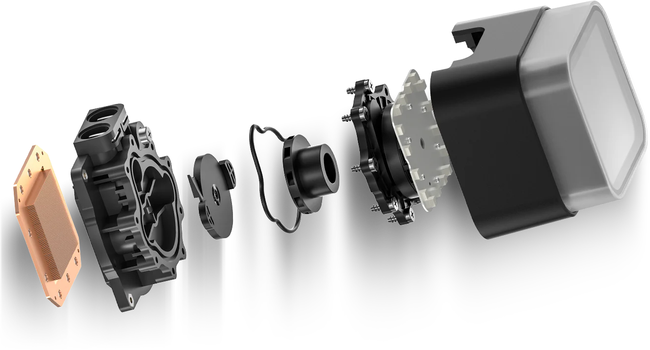 Powered by a 3-phase, 6-slot, 4-pole motor with FOC control, the 6th-generation water pump delivers more efficient, quieter operation across a PWM range of 2,500 to 3,400 RPM. An expanded copper base and fine-tuned microfin geometry help maximize thermal transfer for high-performance cooling.