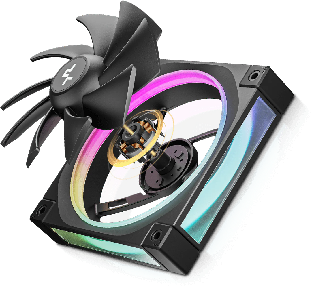 The FL12 fans frame the radiator with vivid ARGB halos, flowing in perfect sync with the pump head to create unified lighting. Built with Fluid Dynamic Bearings, they help ensure quiet, consistent operation for long-term use.