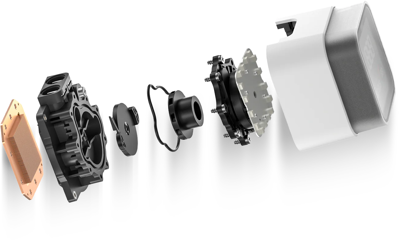 Powered by a 3-phase, 6-slot, 4-pole motor with FOC control, the 6th-generation water pump delivers more efficient, quieter operation across a PWM range of 2,500 to 3,400 RPM. An expanded copper base and fine-tuned microfin geometry help maximize thermal transfer for high-performance cooling.