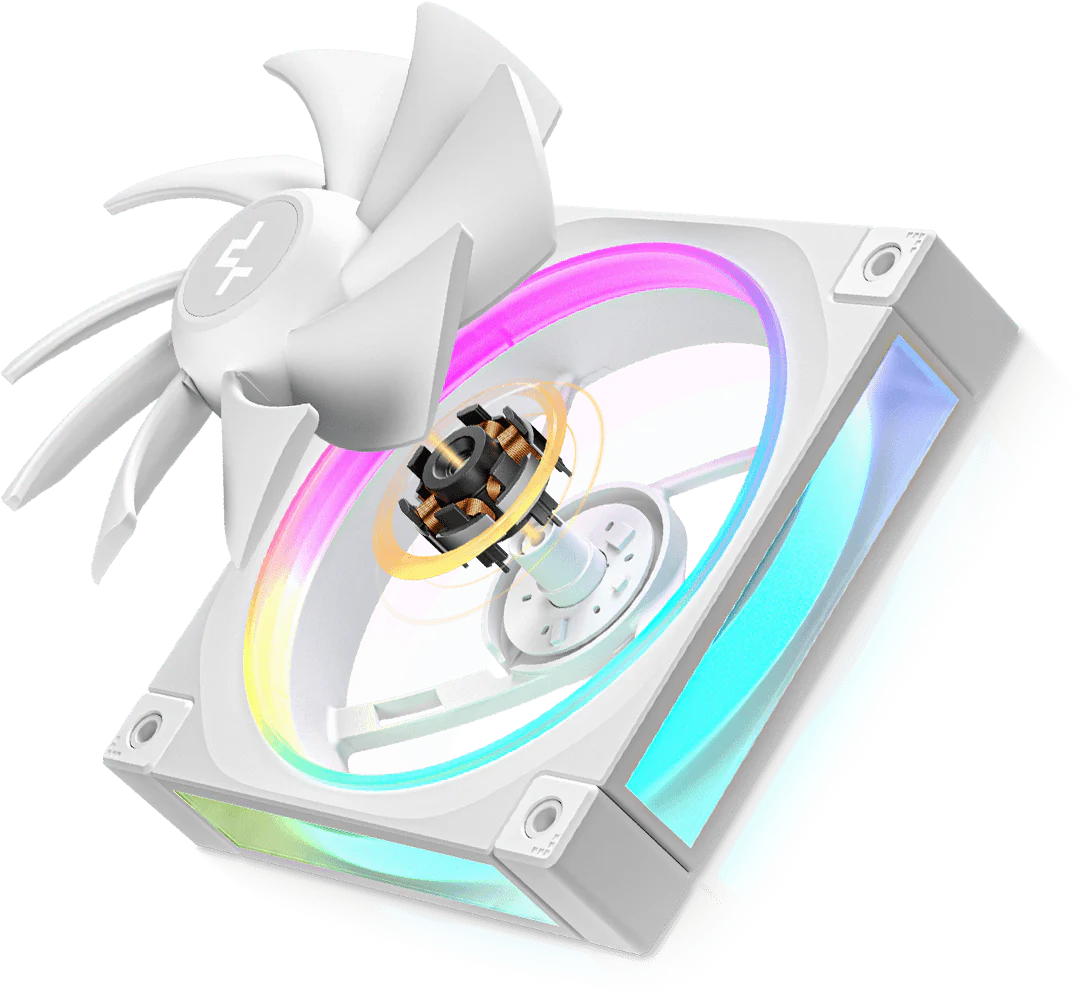 The FL12 fans frame the radiator with vivid ARGB halos, flowing in perfect sync with the pump head to create unified lighting. Built with Fluid Dynamic Bearings, they help ensure quiet, consistent operation for long-term use.